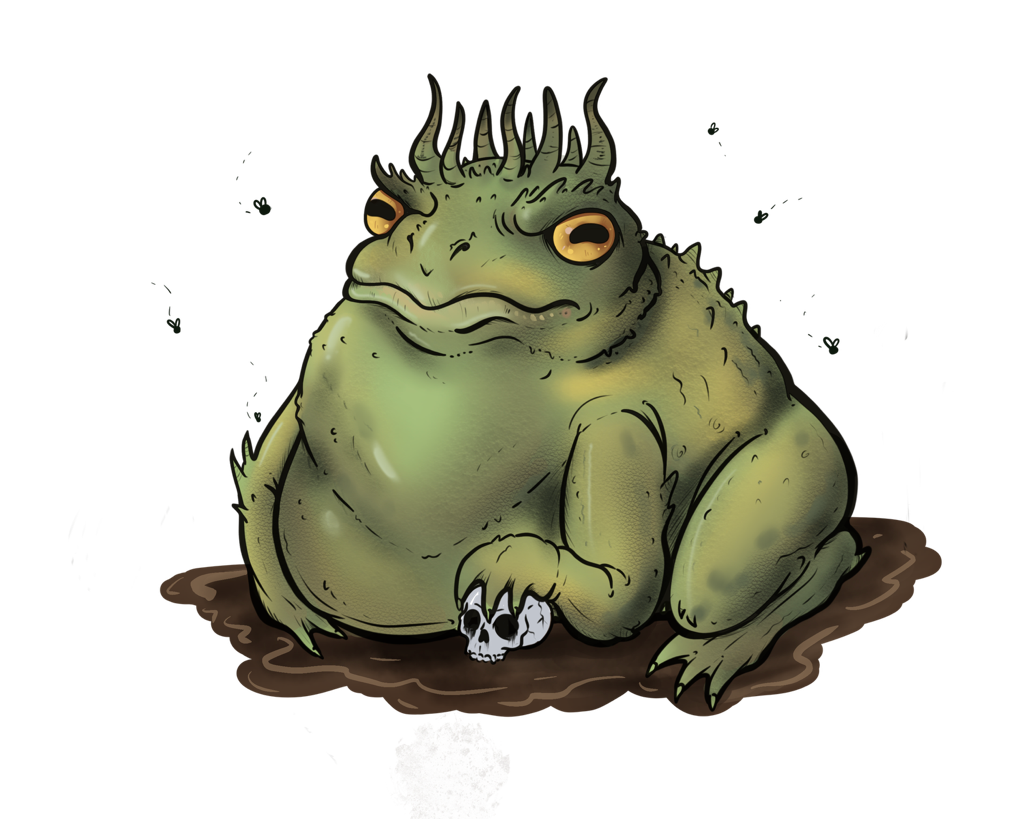 When powerful magic places a curse over a location, it can sometimes manifest in the emergence of a Toad King. These corpulent monsters actively foul the area around them, causing the terrain to devolve into a stinking mud pit, sometimes with a series of wet muddy caves underneath. The only bright side to the emergence of a Toad King, is if you can kill it, it frequently breaks, or at least diminishes, the curse that caused it in the first place.