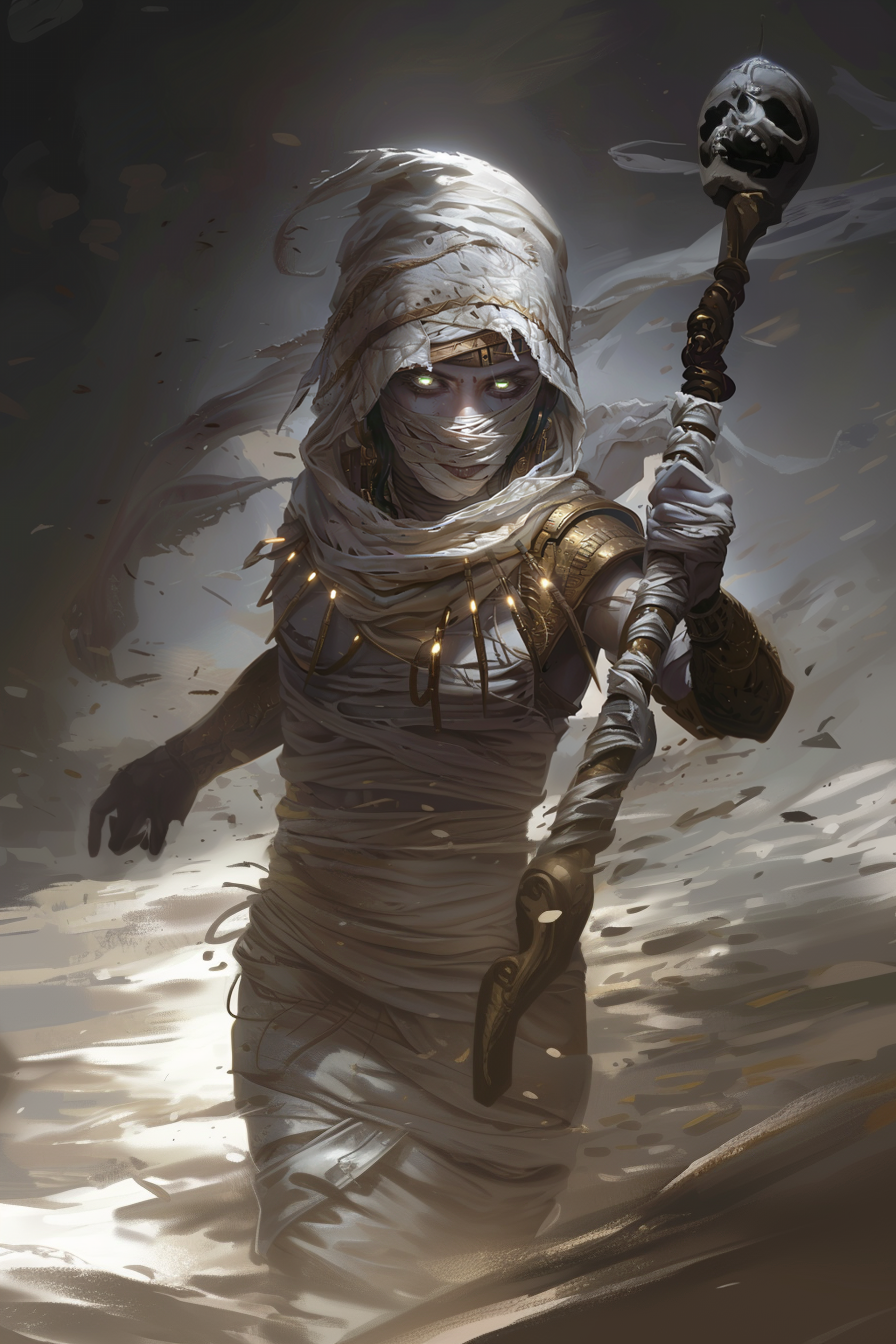 Mummies are created in rituals of embalming, typically involving sacrifices of living creatures. They are often bound to specific places such as temples or tombs, or bound to tasks, such as avenging the robbing of a grave.