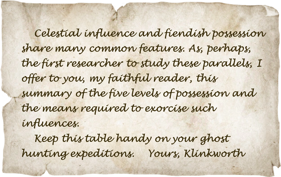 Dear reader, following the unexplained disappearance of Cadius Klinkworth, famed author of Klinkworths' Compendium of Spirits, (and the dispersing of his assets among his creditors), previously-unpublished notes written in the exorcists's own hand have recently become available. As his longtime publisher, we hope you profit from this handy guide for the ghost hunter from the late (but not sorely missed) Cadius Klinkworth. (See also the DM resource More Ghosts). Klinkworth's experience may yet prove valuable to you and your companions as you delve into the mysteries of the occult and seek to thwart evil and its incursions.