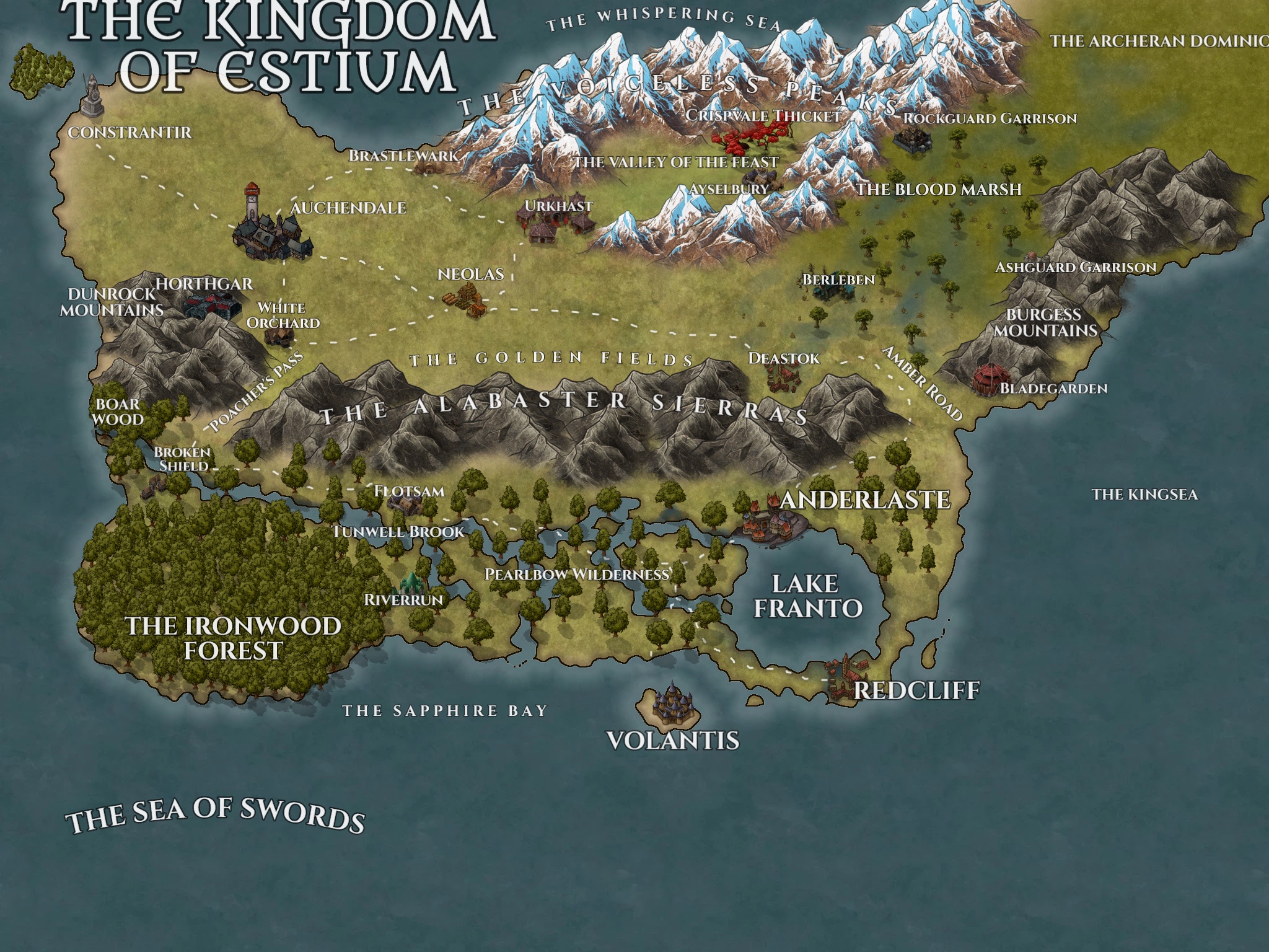 The nation's true might lies around the Sapphire Bay, a deep well of water encrusted with rings of dense coral and bordered by much of Estium's southern coast. The entire bay was rich with sea and plant life, enough to support a trio of influential trade cities: the Gal-Haldirian city of Skyhaven, the Keldiharian built city of Volantis, and ancient capital of Anderlaste.