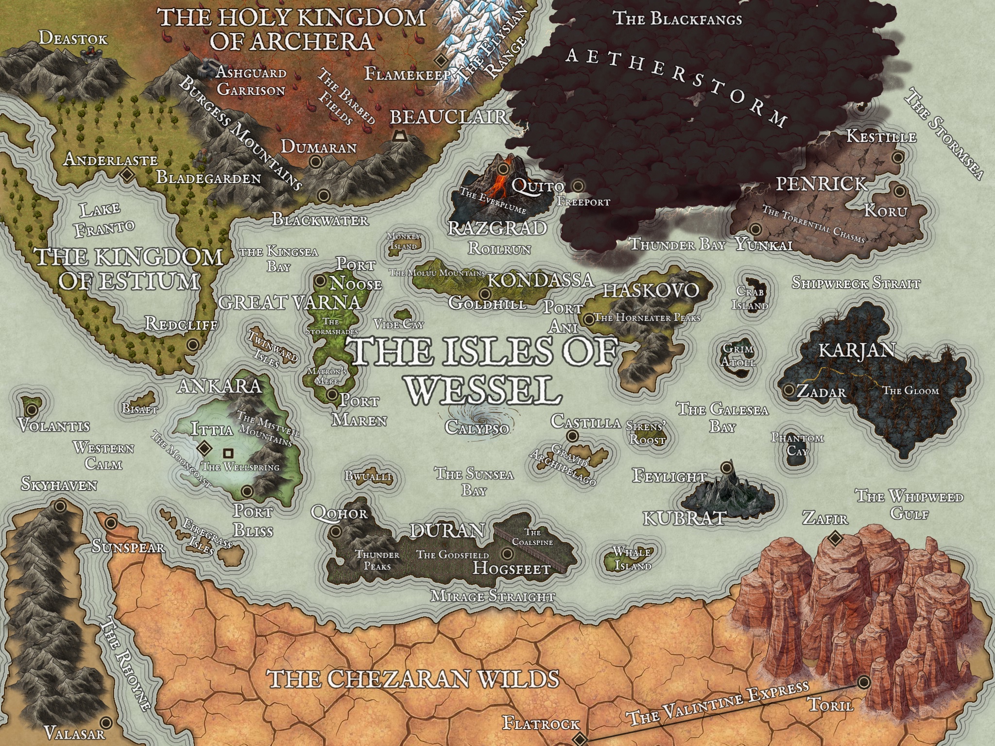 Penrick - Situated closest to the tumultuous Sea of Storms, Penrick bears the relentless assault of full-strength Aetherstorms. On calm days, its jagged mosaic of plateaus, interspersed with treacherous chasms, forms an already unforgiving terrain practically devoid of life. Dubbed the Torrential Chasms, these gaping rifts are transformed into roaring torrents during storms, as they flood with rushing waters able to crush a human in seconds. However, on the western side sits Yunkai, a robust keldiharian built city once home to the Stormcaster, an ancient arcane technique for Aetherstorm control. Post-Stormspire, Yunkai is famed for the Miva Institute of Arcane Knowledge, a prestigious arcane school with a reputation for dangerous teaching methods. To the west, Keslte and Koru cling to life amongst the Aetherstorms, engaging in a hazardous scavenger hunt. Their prize? The coveted Aetherblades and Aetherplate, powerful artifacts that sometimes rain down during Aetherstorms. If they manage to find one, they are set for life with the riches selling one would behold, but one must avoid the gargantuan crustaceans known as Chasm Fiends.