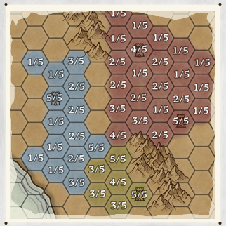 For example, Blue attacks a neighboring Red space. Blue has 3 units with no special modifiers. Red has 2 units with no special modifiers. Blue rolls a 6, a 5, and a 1. Red rolls a 6 and a 3. Only Blues two highest rolls will be compared to reds. Blue 6 vs Red 6. Both units bounce and don’t harm each other. Blue 5 vs Red 3. Blue’s unit is victorious over Red’s unit and kills it, leaving red with 1 defender for the next round of the attack.