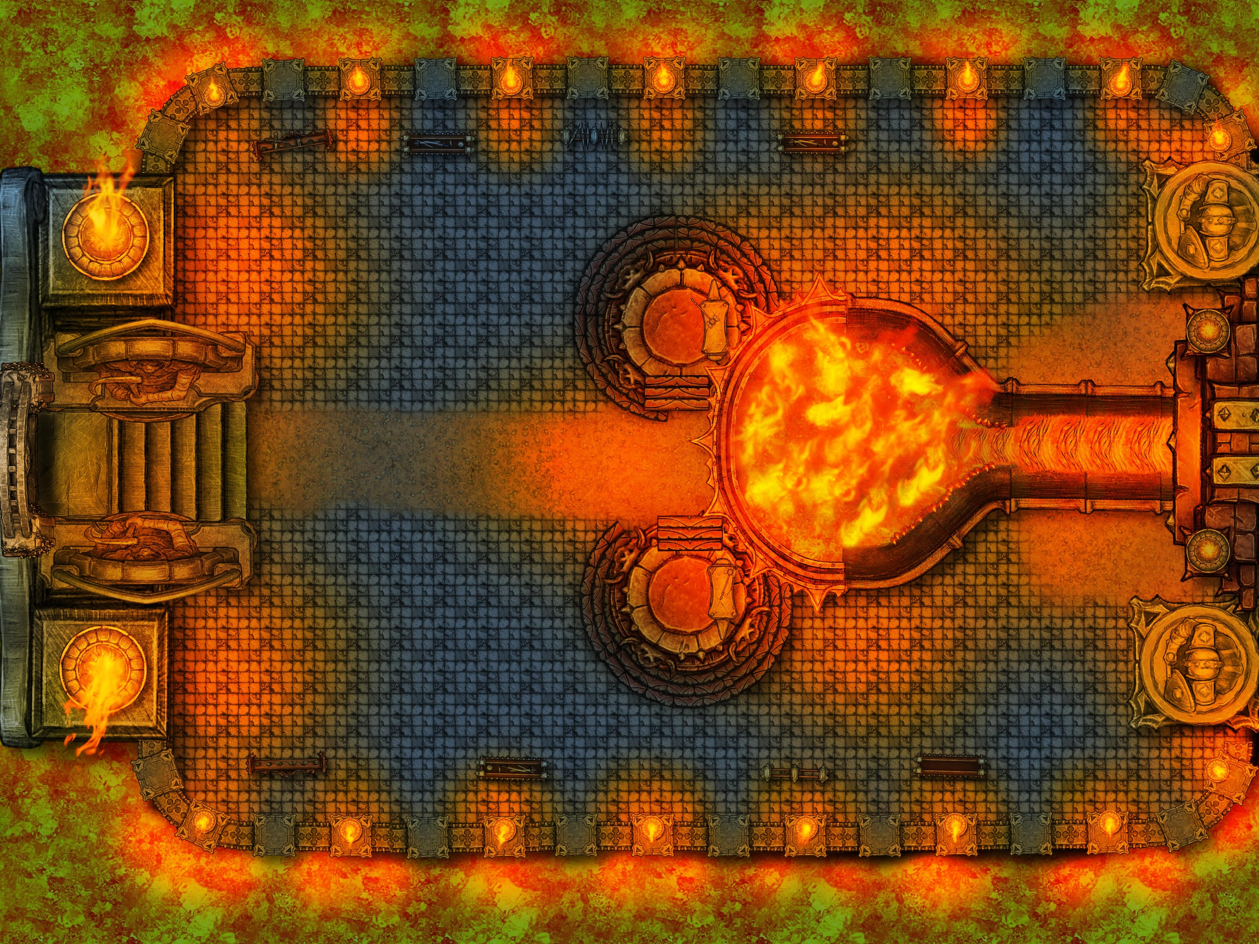 O grupo chega às ruínas fumegantes do Templo da Forja de Hefesto, onde o cheiro de metal queimado paira denso no ar. As paredes de pedra enegrecidas, uma vez gravadas com runas divinas, agora desmoronam sob o peso da rocha derretida que antes dava vida ao templo. Rios de lava esfriando serpenteiam pelos destroços, chiando e estalando enquanto se solidificam em cicatrizes de obsidiana irregulares.