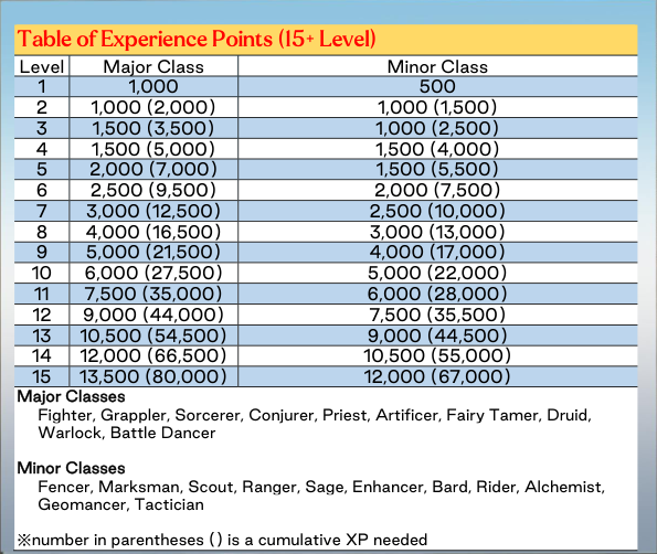 Classes are split into the following categories: Warrior-type, Wizard-type, and Other-type. In addition, these are further devided into Major and Minor, which determines how much Experience they take to level up.
