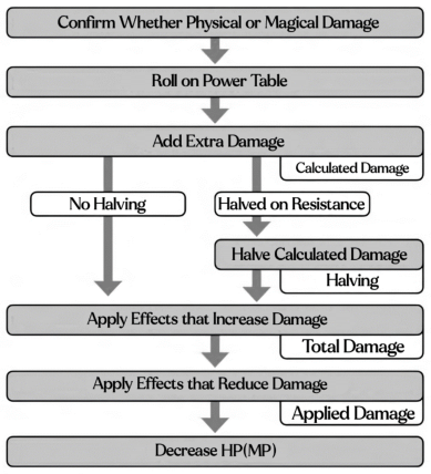 Most damage-dealing spells use a Power Table to determine the Calculated Damage. Such spells are described in the magic data as “Power X + Magic Power’ damage.