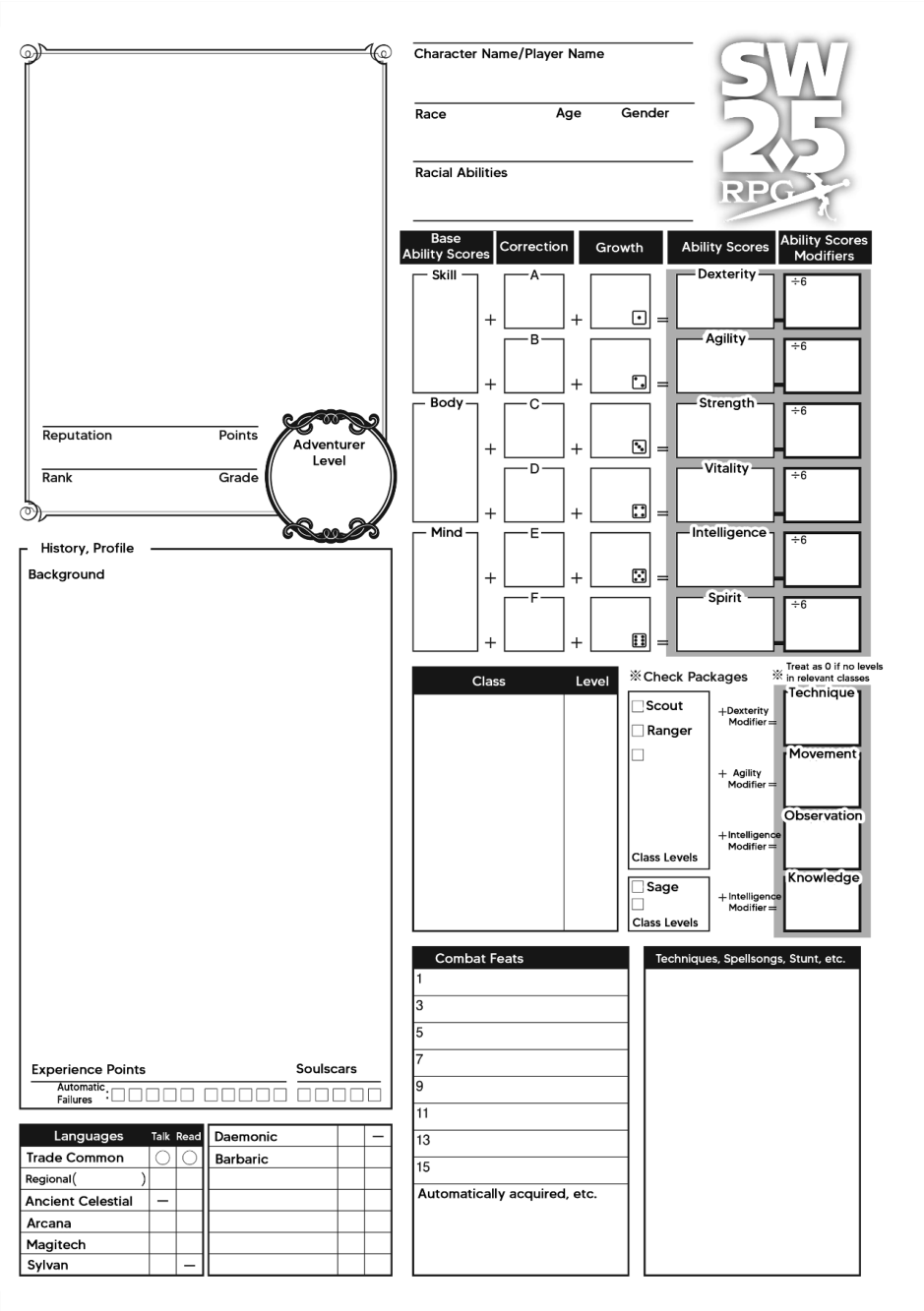 This section is for listing your classes and their levels, calculating the Standard Value for checks and listing your combat feats. Certain classes, suche as Enhancer, Rider, and Bard, give special abilities that are listed under the "Techniques, Spellsongs, Stunts, etc." box.