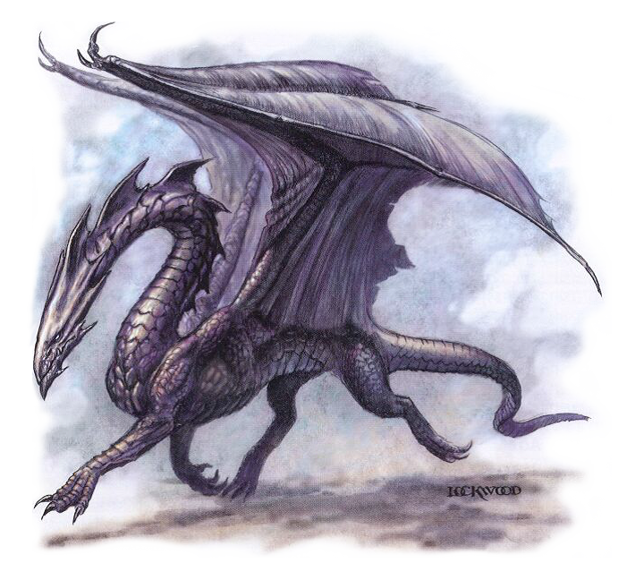 The long body of a purple dragon is particularly lithe, catlike, and serpentine. This, along with its swept-back wing structure and sleek, tapered head allows it to worm its way through narrow tunnels. Their eyes are a pale, sinister blue. Their scales are larger but flatter than other dragons, coated in a slimy fluid that masks their distinct ophidian smell.