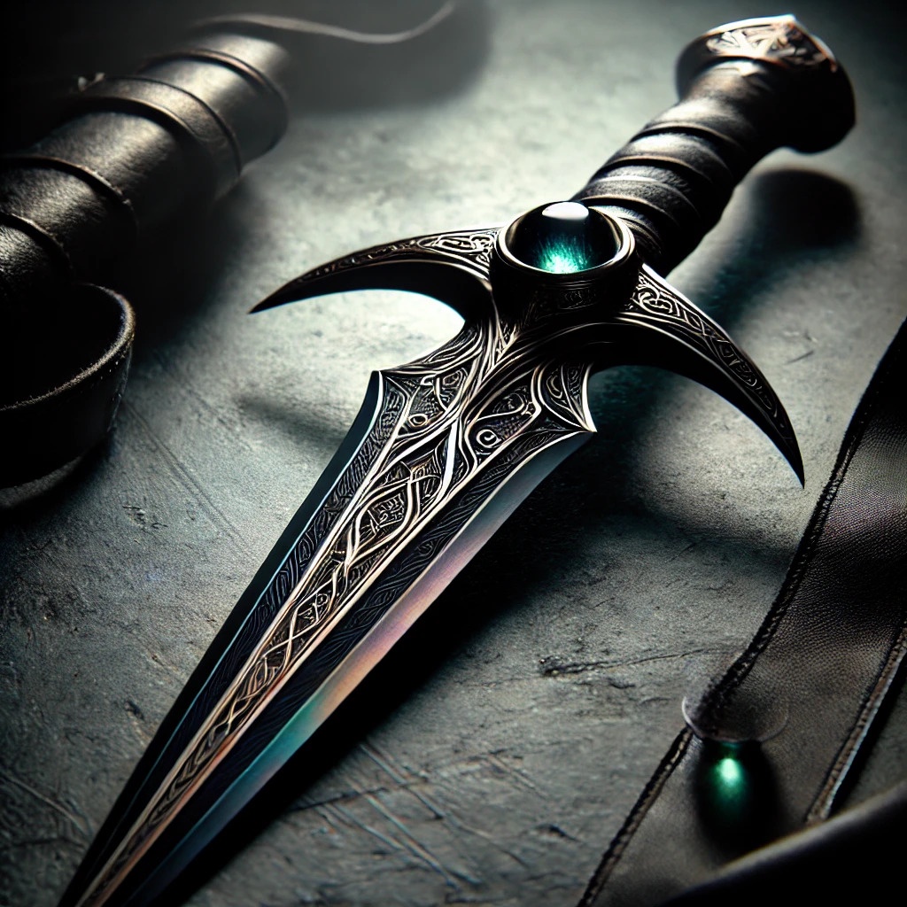 Whisperfang is a sleek dagger forged from dark mithral, its blade shimmering with an iridescent sheen. Runes etched along its edge whisper faintly, inaudible to all but its wielder. The hilt is wrapped in supple black leather, and a faint aura of shadow clings to the weapon, rendering it almost invisible in dim light. Once wielded by an infamous shadow assassin, this relic has become a symbol of precision, stealth, and lethality.