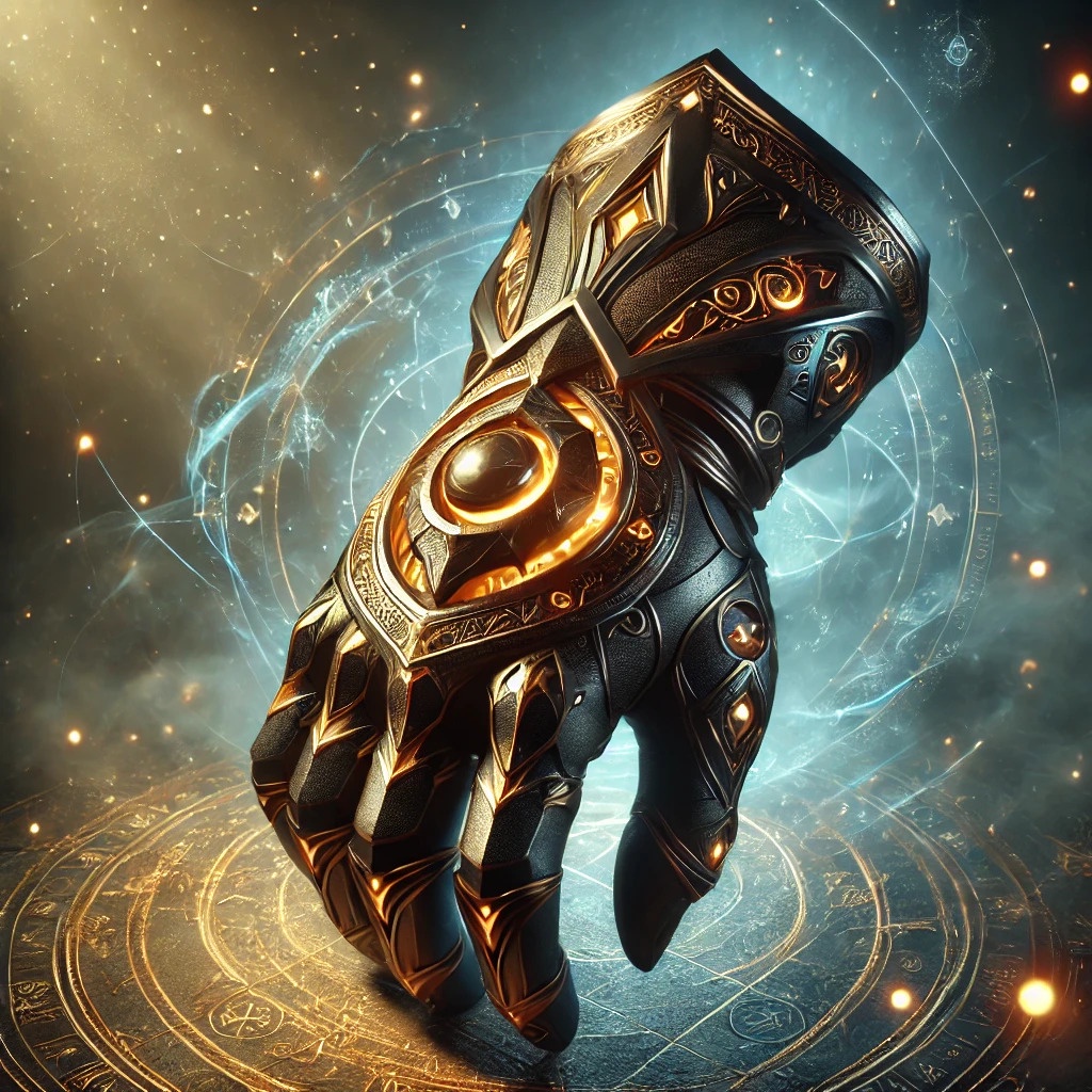 The Aegis of the Shadows is a masterfully crafted gauntlet that seamlessly merges divine craftsmanship and subtle artifice. Made from dark steel adorned with faint, glowing golden etchings, the artifact pulses with a soft, rhythmic light, symbolizing its duality of purpose: protection and subterfuge.