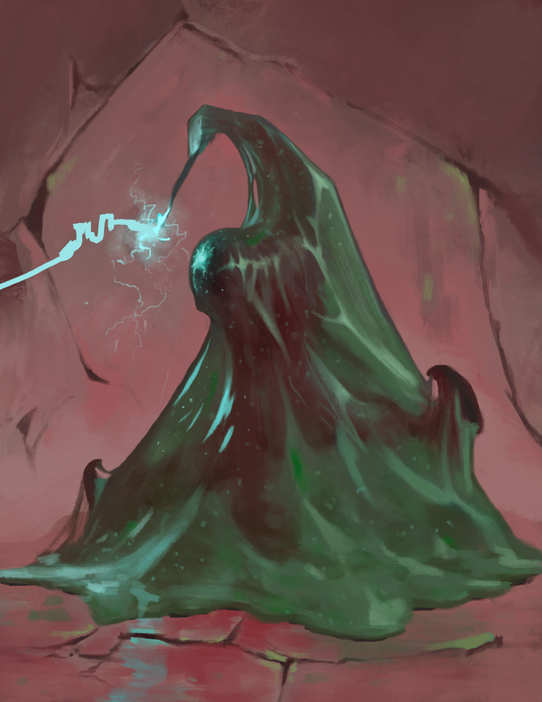 Oogoo have three opaque eyes that are embedded within their gelatinous bodies, which come in a wide variety of colors ranging from bright blues to deep mauves. The malleability of their bodies allows them to reshape their physical form at will. Though they tend to take on a humanoid form around other peoples, their native appearances are much more amorphous. When Oogoo move, they take the form of a thin, running stream that allows them to seep through tight cracks and crevices. As such, they can make their homes in places inaccessible to most other societies, such as worm-like tunnels underground and narrow cavities in trees.