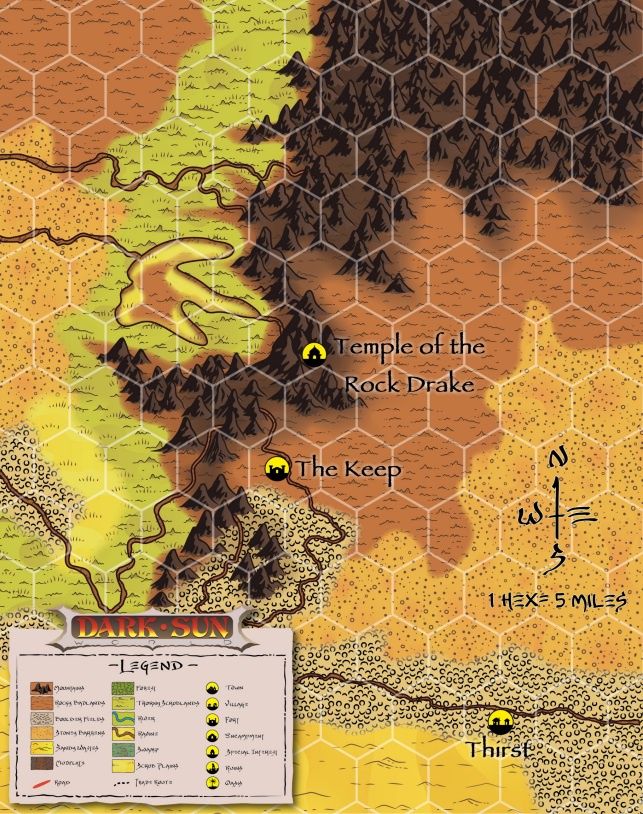 Three events punctuate the trip to the temple, occurring in the last 24 hours of the journey, with the Akterec encounter occurring last and upon arrival to the temple site. If the party is traveling with Raxan, they are posted as scouts to protect the flanks and scavenge any halfling encampments. Raxan’s caravan begins with 32 Athasian bandits, 2 tarek, 1 acolyte (sun para-elemental cleric), and 6 domesticated kanks with supplies and gear.