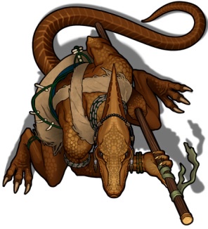 - Akterec: Pterran druid, upright lizard man with three-fingered hands and tail, small slits for ears, no visual difference between males and female pterrans. In native language communicates with hisses and pops as well as fingers to click and tap. When speaking Common, still uses hisses and finger clicks. Wears clothing only when in settlements. Always calm, always looks into eyes when talking.