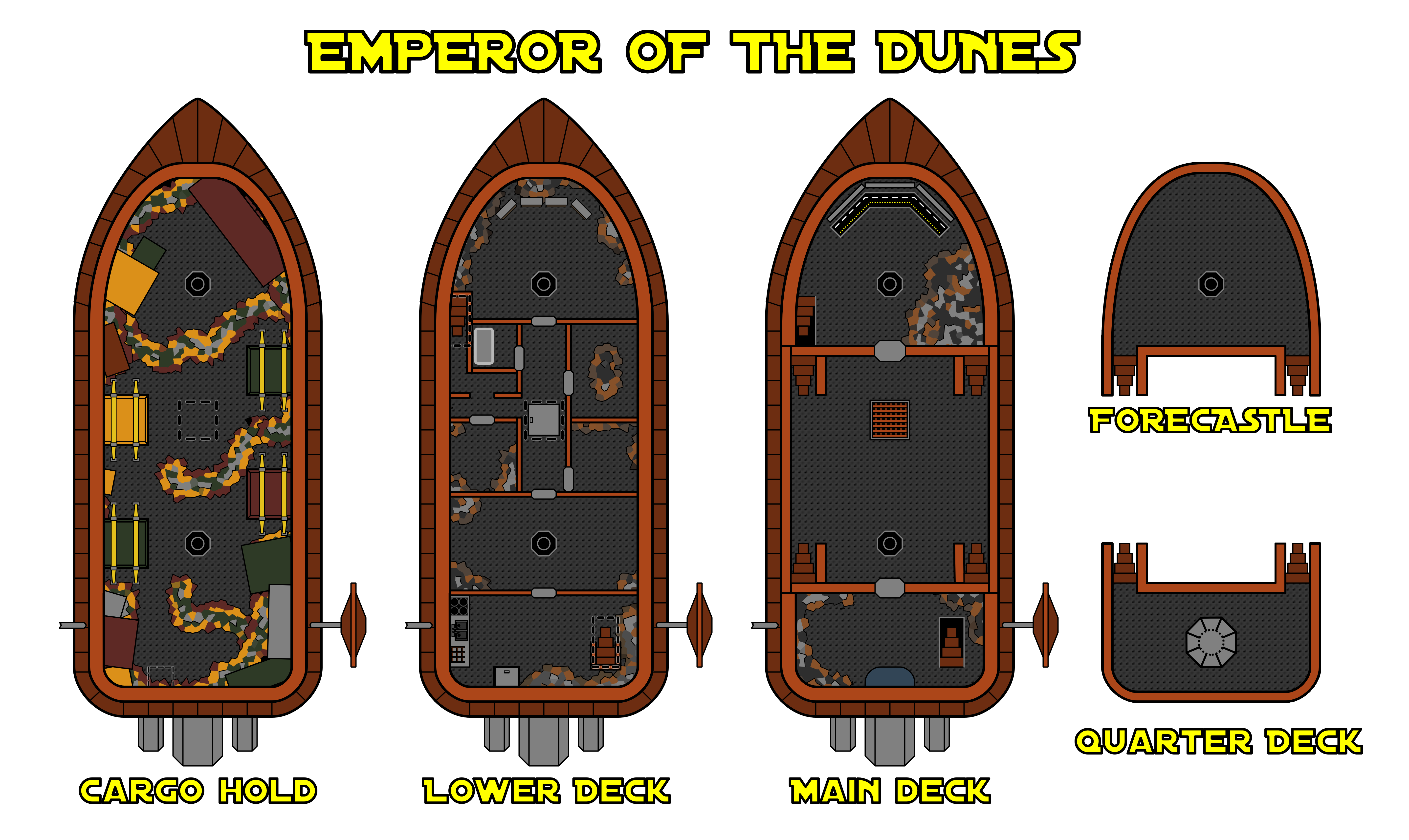 After losing Emperor of the Dunes, Aubreck was forced to cancel an order he lodged with Ubrikkian Industries for a sister ship of the same design. Should the party succeed in returning his goods, he is willing to reopen the order on the barge and gift it to them in memory of the original Emperor. Deck plans for a restored Emperor can be found in Appendix C.