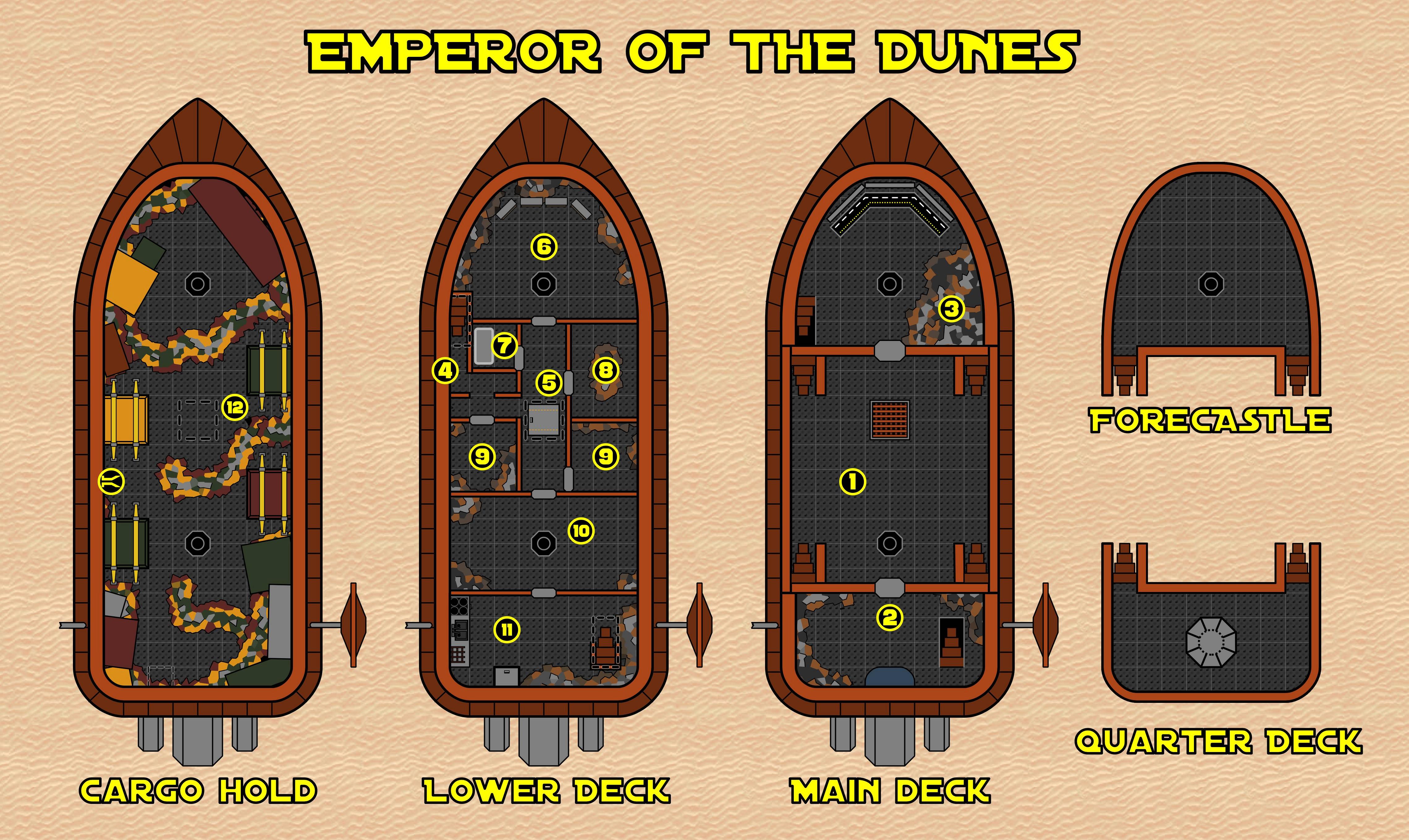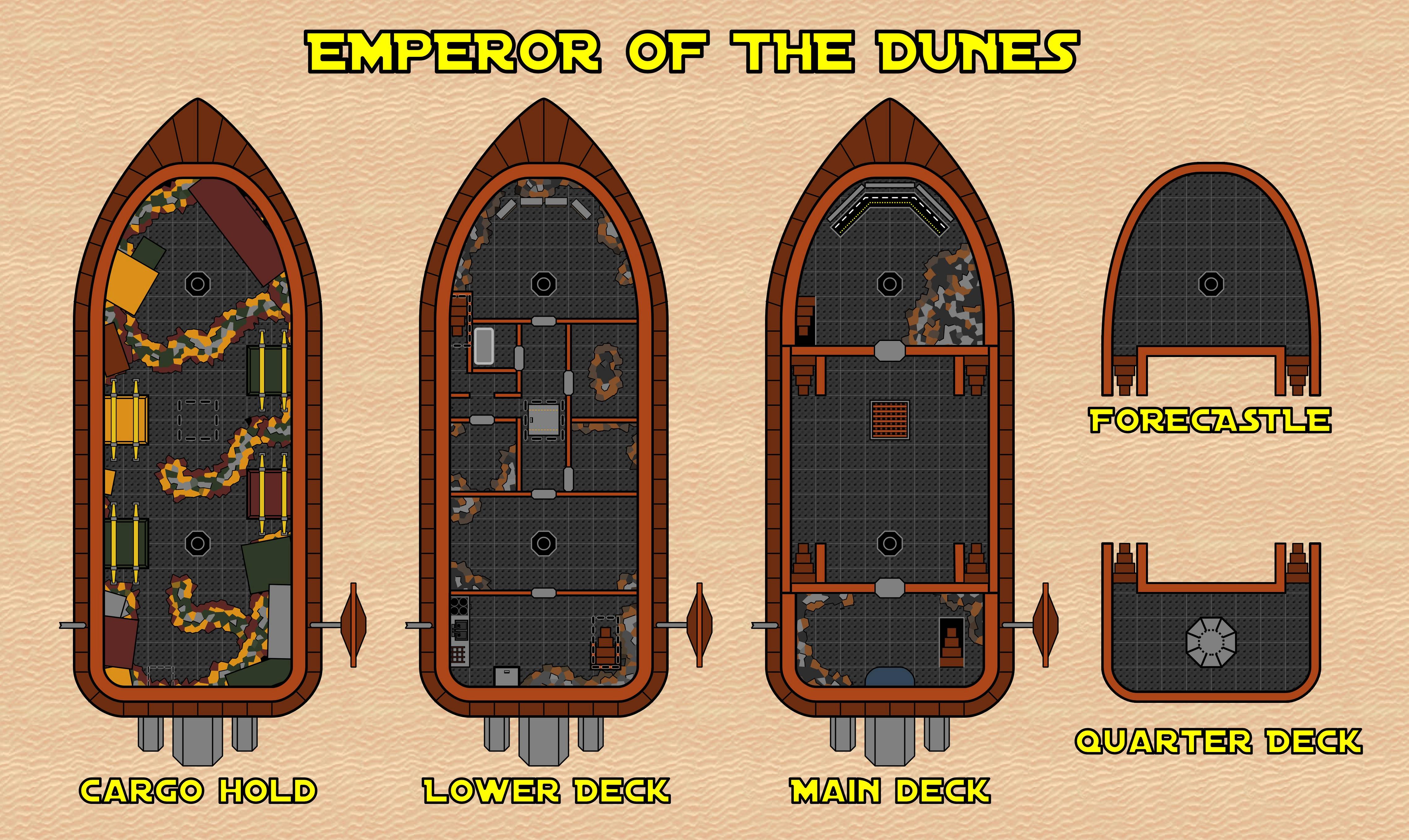 - A layout of the Emperor of the Dunes, which Aubreck may be able to provide to the party if requested