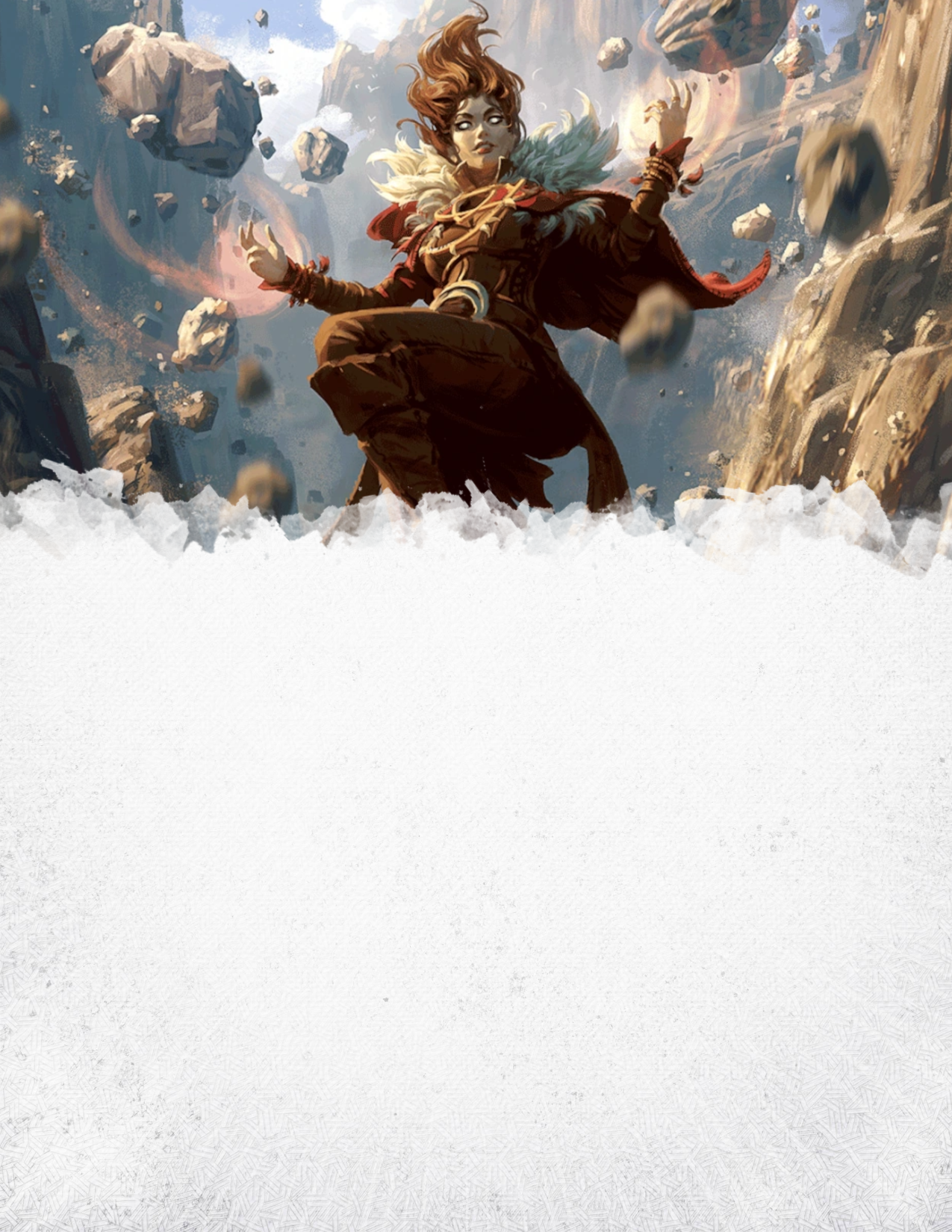 Geomancers are students of natural harmony and the land. Understanding it on a deep, intuitive level, they are able to channel the strength of the earth through themselves, bringing to bear the fury of the planet itself against those who would despoil and desecrate it. Their intimate knowledge of the world also makes it easier for them to traverse its many biomes and wonders: an accomplished geomancer is as comfortable standing in the midst of a blizzard as in the heart of an active volcano.