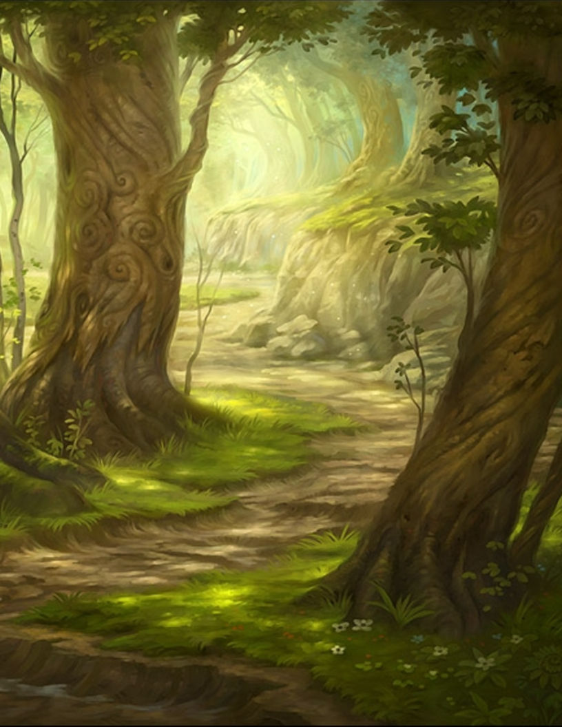 Let’s use a forest map as an example. It has unstable cliffs in the top left corner with a dirt path used by travellers; however, something suspicious is afoot. A large tree is blocking the path, and a cart is damaged and has been dragged under a nearby tree.