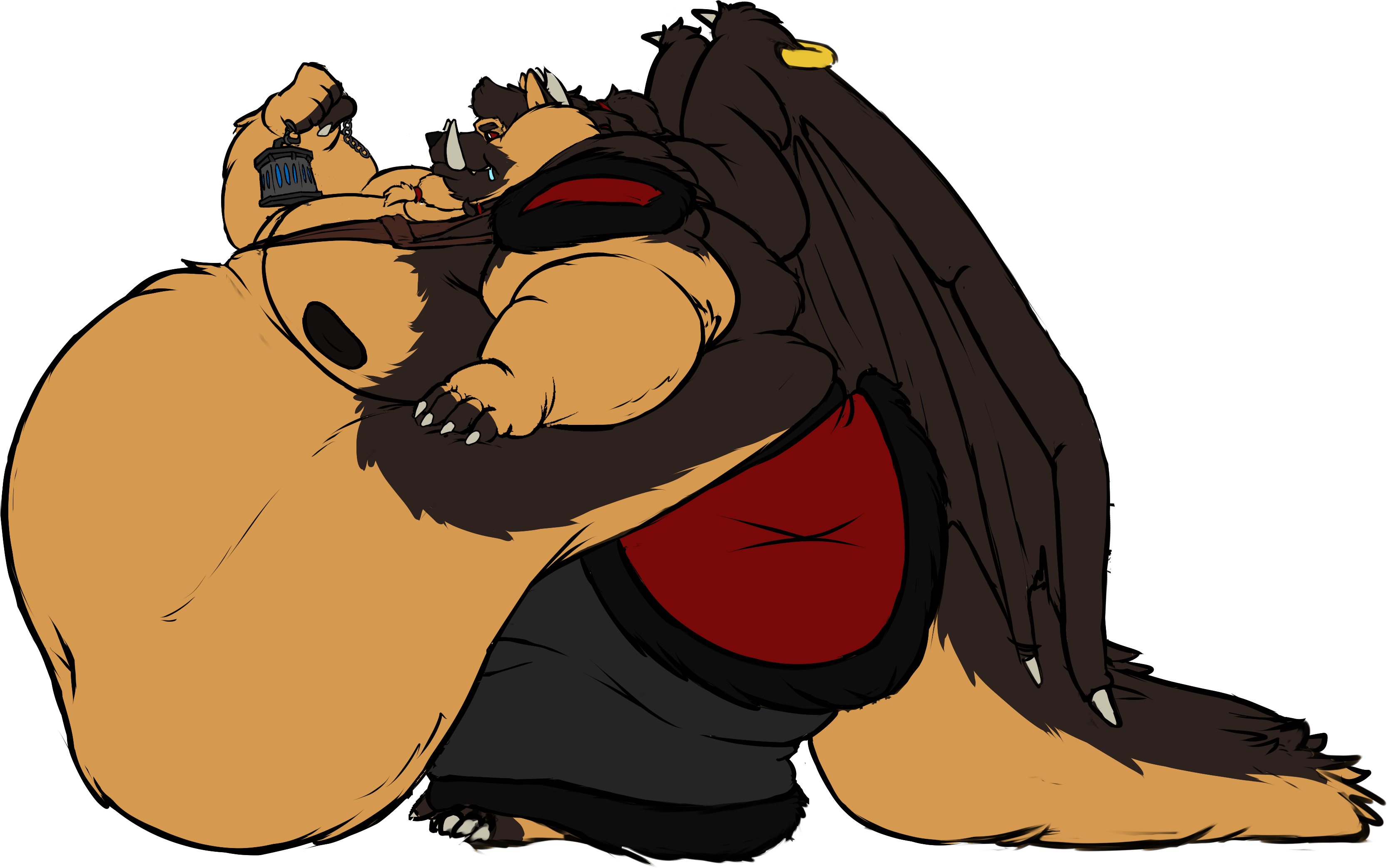 As you question and ponder, a rift of blue and black flame opens in front of you. Stepping out is a large orb of caramel colored fur, sloshing and swaying with every lumbering step as teh rest of the body follows in. With a head of shaggy chocolate brown hair tied back into a pony tail and a braid on either side, small horns perched behind the ears, massive tusks from his lower jaw, all paired with a pair of piercing eyes with white pupils, black irises, and red sclera with an almost otherworldly glow. The terrifying face, size, and stature of the creature before you leaves little to the imagination of what he may be- a fiend of some sort... perhaps a demon? But also a canid?